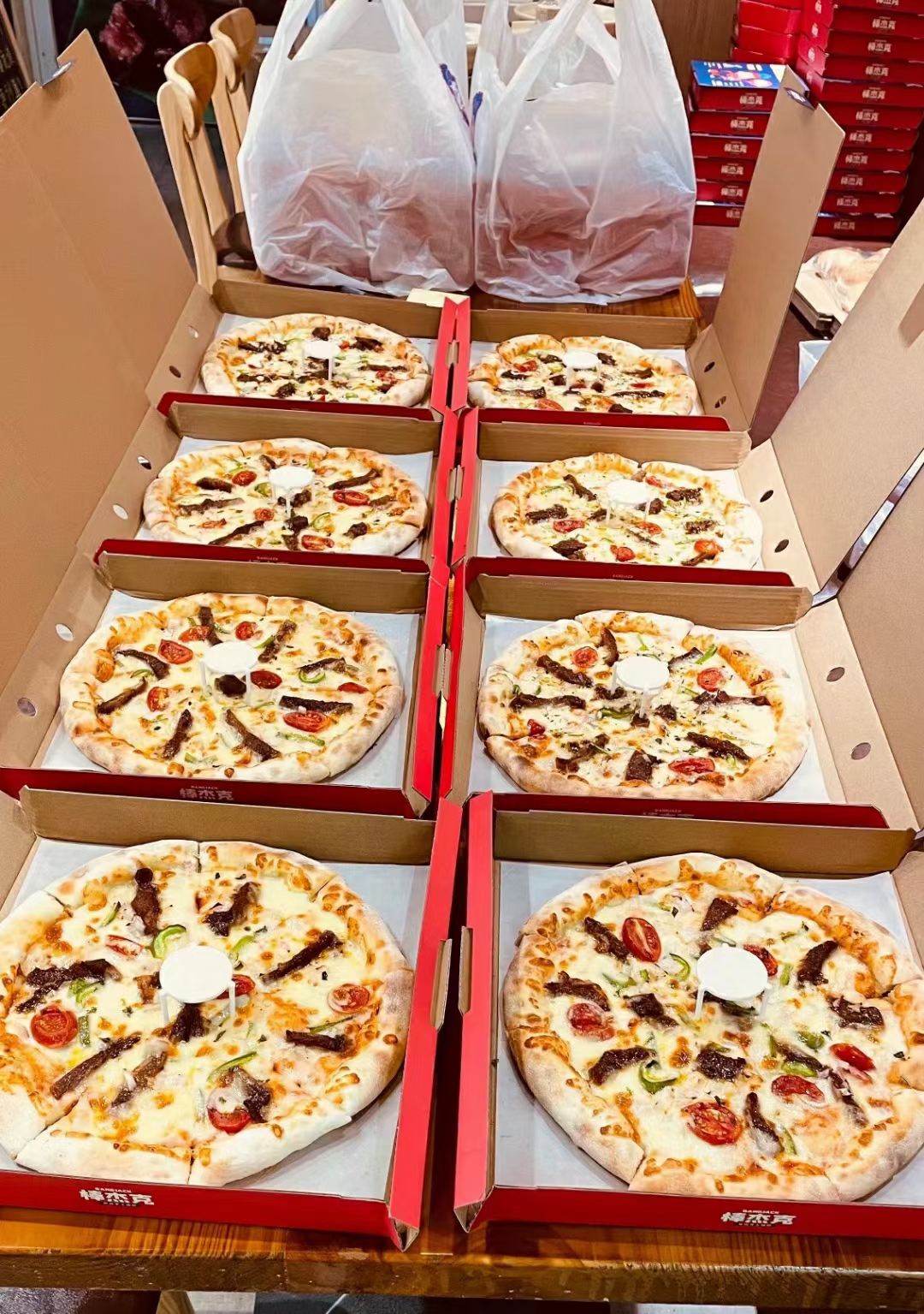 用牛排做披萨太好吃了,那么多张出炉就被抢光。